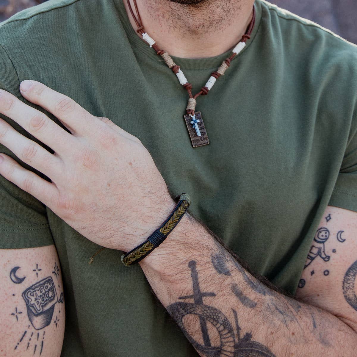 Embrace the essence of nature with the Forest Whisper Bracelet. Crafted from richly textured green and black leather, this adjustable woven bracelet combines rugged durability with elegant design. The harmonious blend of colors evokes the tranquility of a lush forest, making it the perfect accessory for the modern man who values both style and nature. Whether worn alone for a subtle statement or layered with other pieces for a bolder look, the Forest Whisper Bracelet from the Aadi Collection adds a touch of sophistication and earthy charm to any outfit.