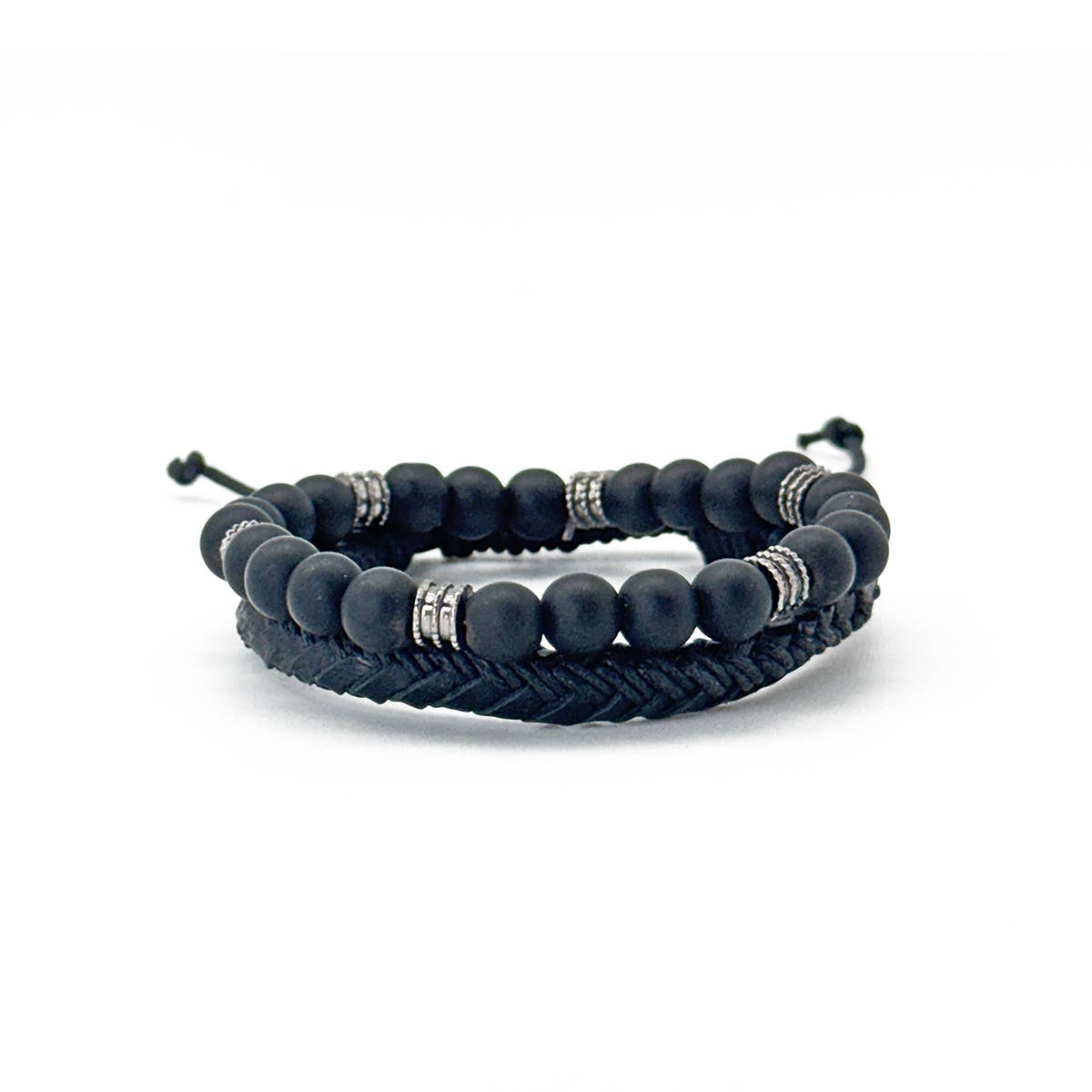 Sleek, bold, and versatile, the Midnight Bound Bracelet offers a perfect combination of style and substance. Featuring a polished black bead bracelet paired with a black woven leather piece, this set exudes a sense of strength and modern elegance. Designed for the man who values subtle sophistication, this bracelet duo adds a timeless touch to any look. Whether worn alone for a minimalist statement or layered with other pieces for a textured effect, the Midnight Bound Bracelet from the Aadi Collection is an essential accessory for every occasion