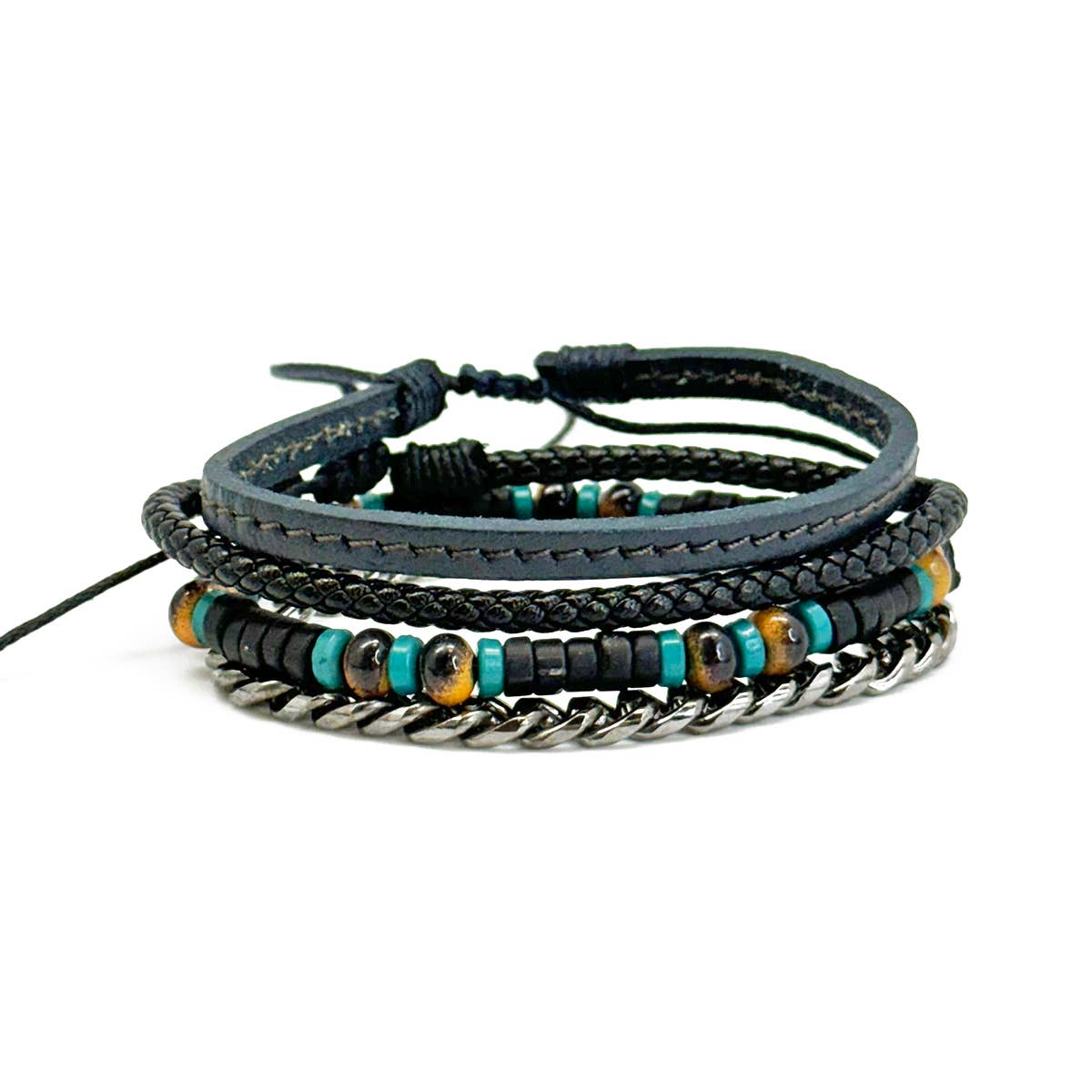 The Midnight Voyage Bracelet is a bold and sophisticated accessory designed for the modern man. This adjustable piece features a sleek black leather bracelet, a textured black braided leather bracelet, and a striking black bracelet adorned with tiger eye and turquoise beads, all beautifully complemented by a robust gray chain. Each element combines to create a dynamic contrast of textures and colors, embodying the spirit of adventure and elegance. Perfect for any occasion, whether worn solo or stacked with other pieces, the Midnight Voyage Bracelet from the Aadi Collection enhances your style and showcases your unique personality.