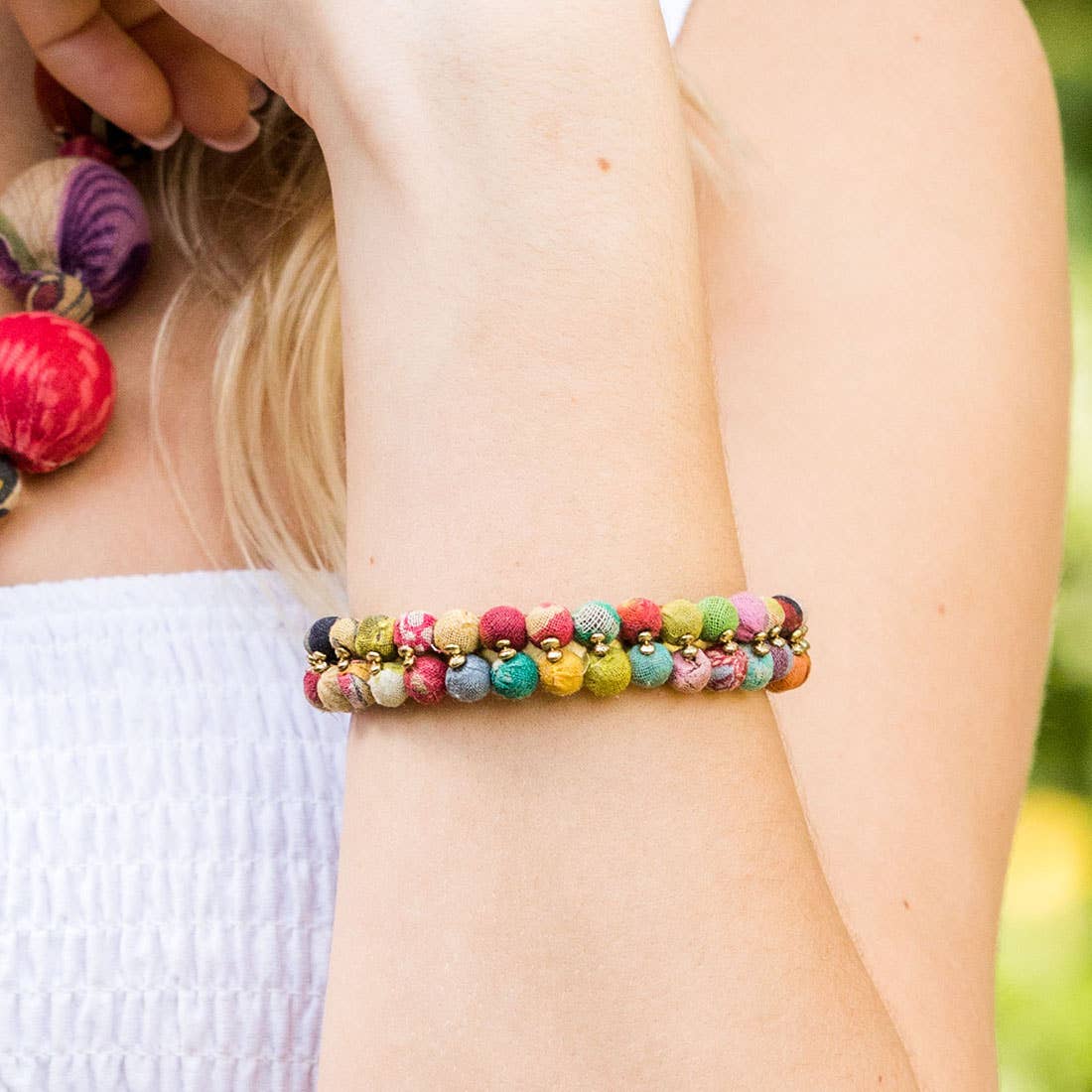 "Aasha" means hope in Hindi. Aasha is a 100% sustainable jewelry line made by an artisan group of economically disadvantaged women. Using discarded saris and wrapping them over small wooden beads these women are able to create a very unique and colorful collection of jewelry. The wooden beads are scraps sourced from furniture factories nearby, and the fabric used to cover them comes from old, worn saris, collected all over India! No two beads will be the same.
