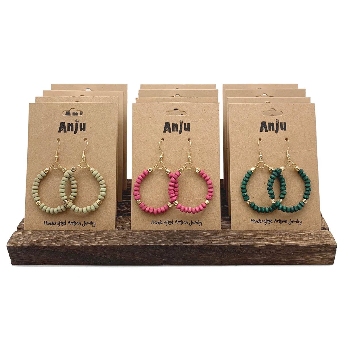 This prepack features 12 pairs of hoop earrings and a wooden display (DW27).