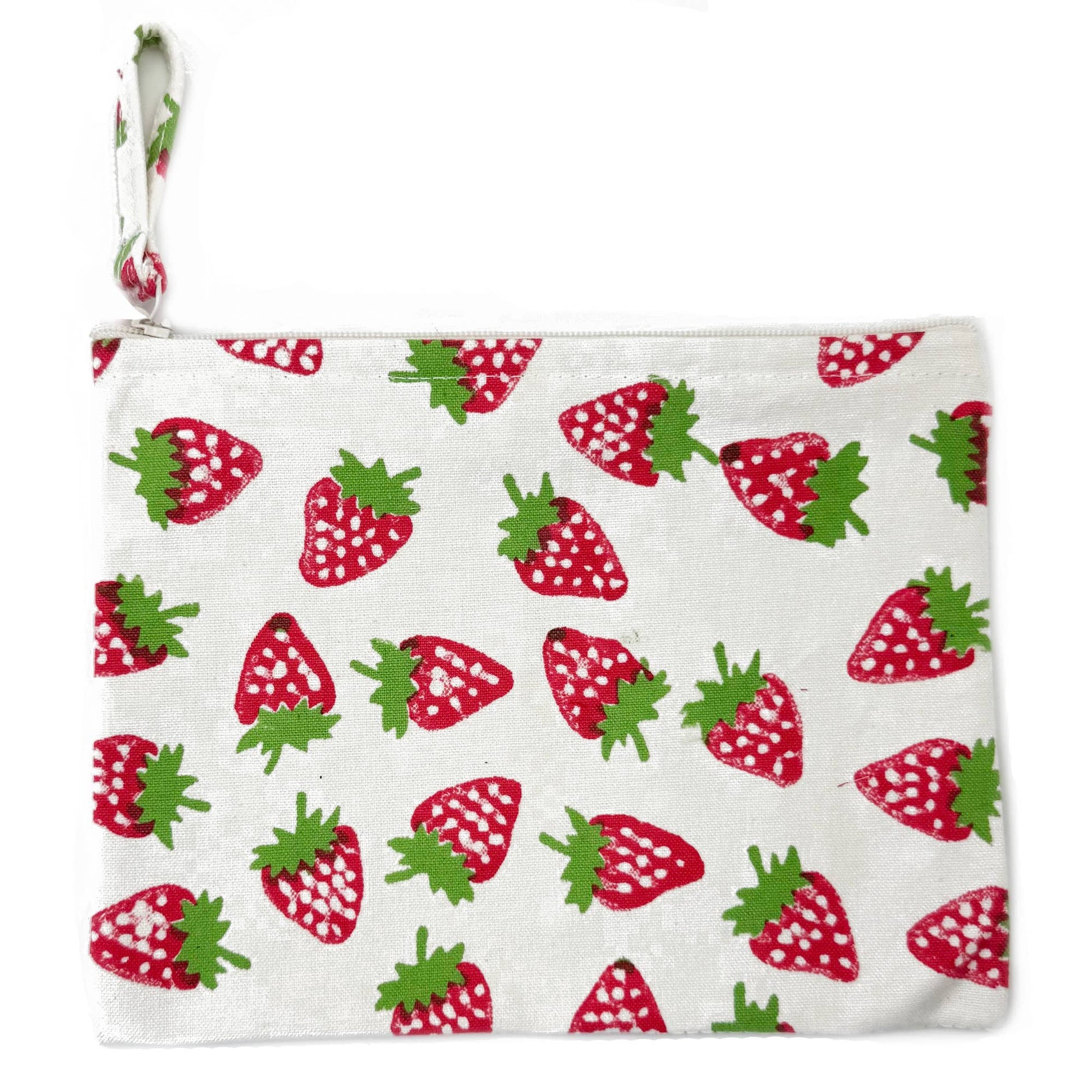 Our Handcrafted Canvas Pouch with Block-Printed Strawberries is a durable and versatile accessory. The design features a vibrant all-over strawberry print.