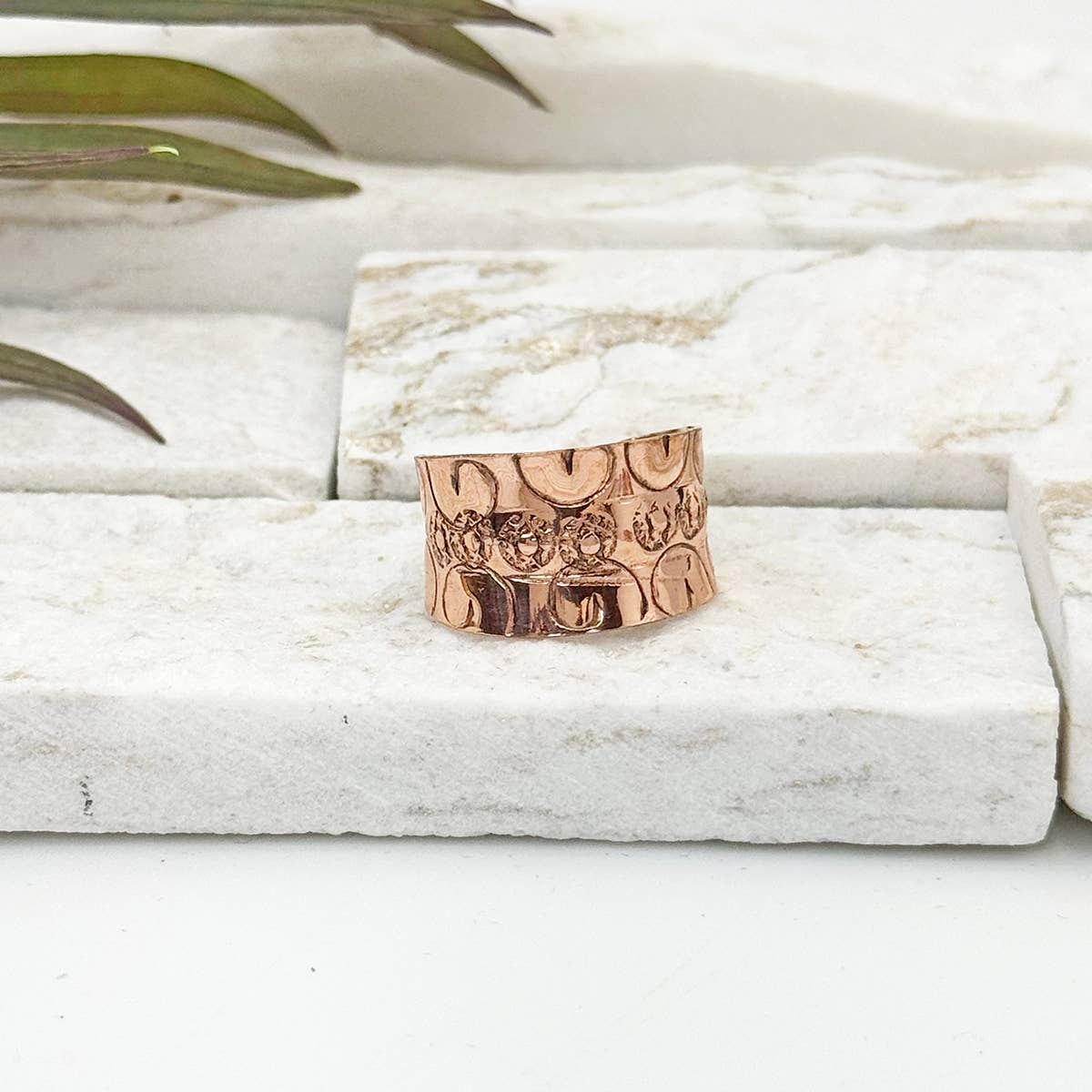 Our Handcrafted Copper Scallop Ring features a patterned design of repeating semi-circles and textures. This wide-band ring is handcrafted from copper with a rustic, artisanal appeal.