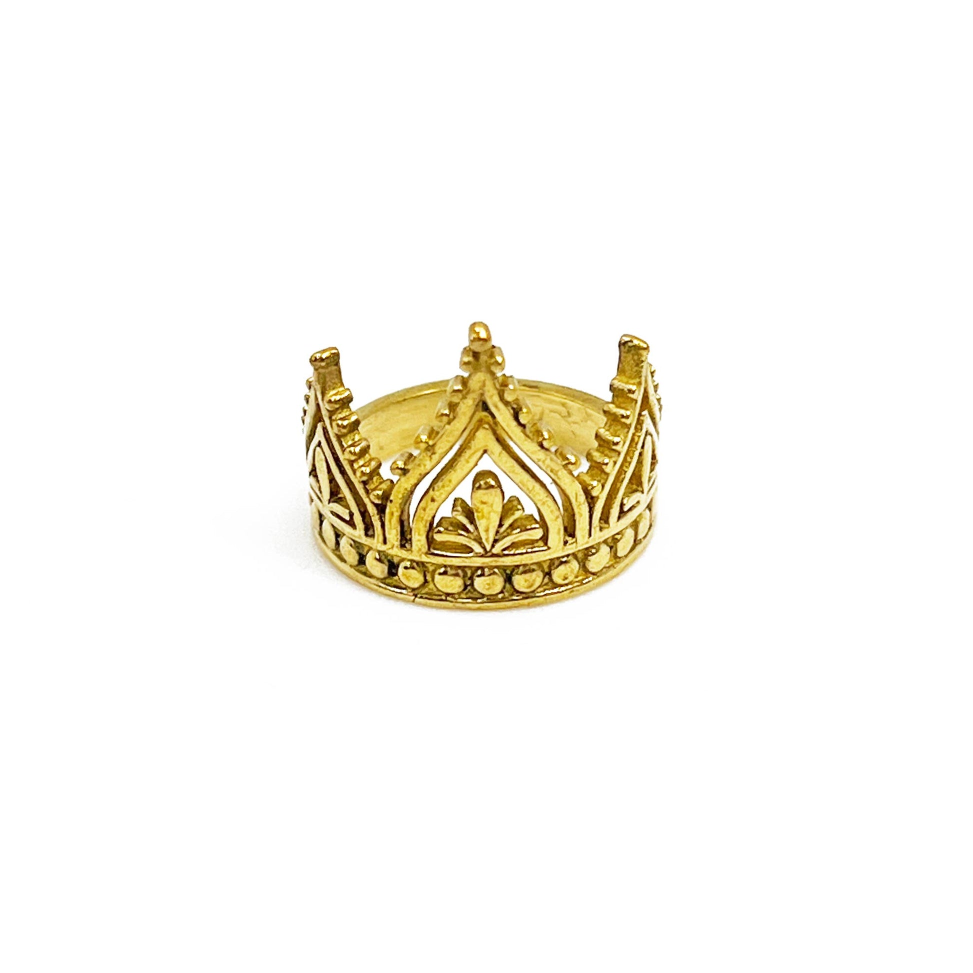 Adjustable ring featuring a detailed tiara design with arches and beaded accents. Gold plated finish on brass base metal.