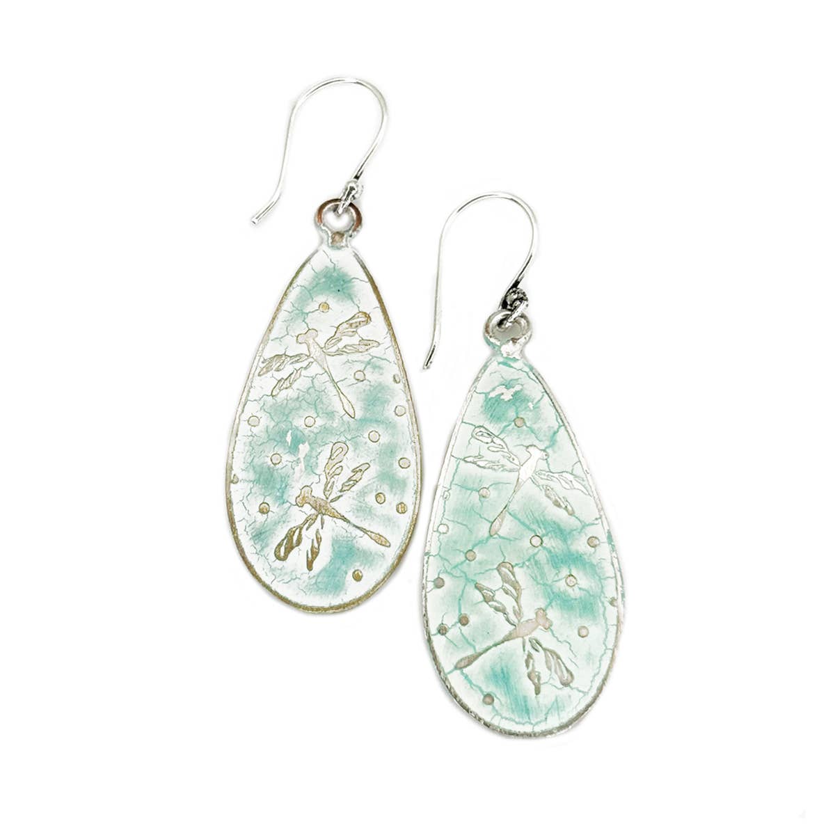These Handcrafted Mint Green Dragonfly Patina Earrings are a teardrop dangle design from our Patina Earring Collection. Handcrafted in India, these lightweight earrings feature a delicate dragonfly pattern on a mint green patina.