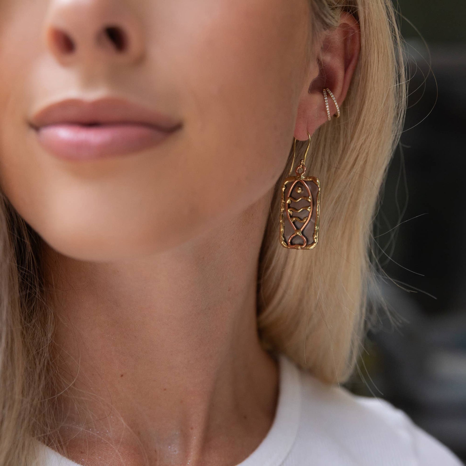 Our Handcrafted Mixed Metal Fish Earrings are an artisanal statement piece. These earrings feature a symbolic fish design outlined in copper with brass accents, set within a rectangular brass frame.