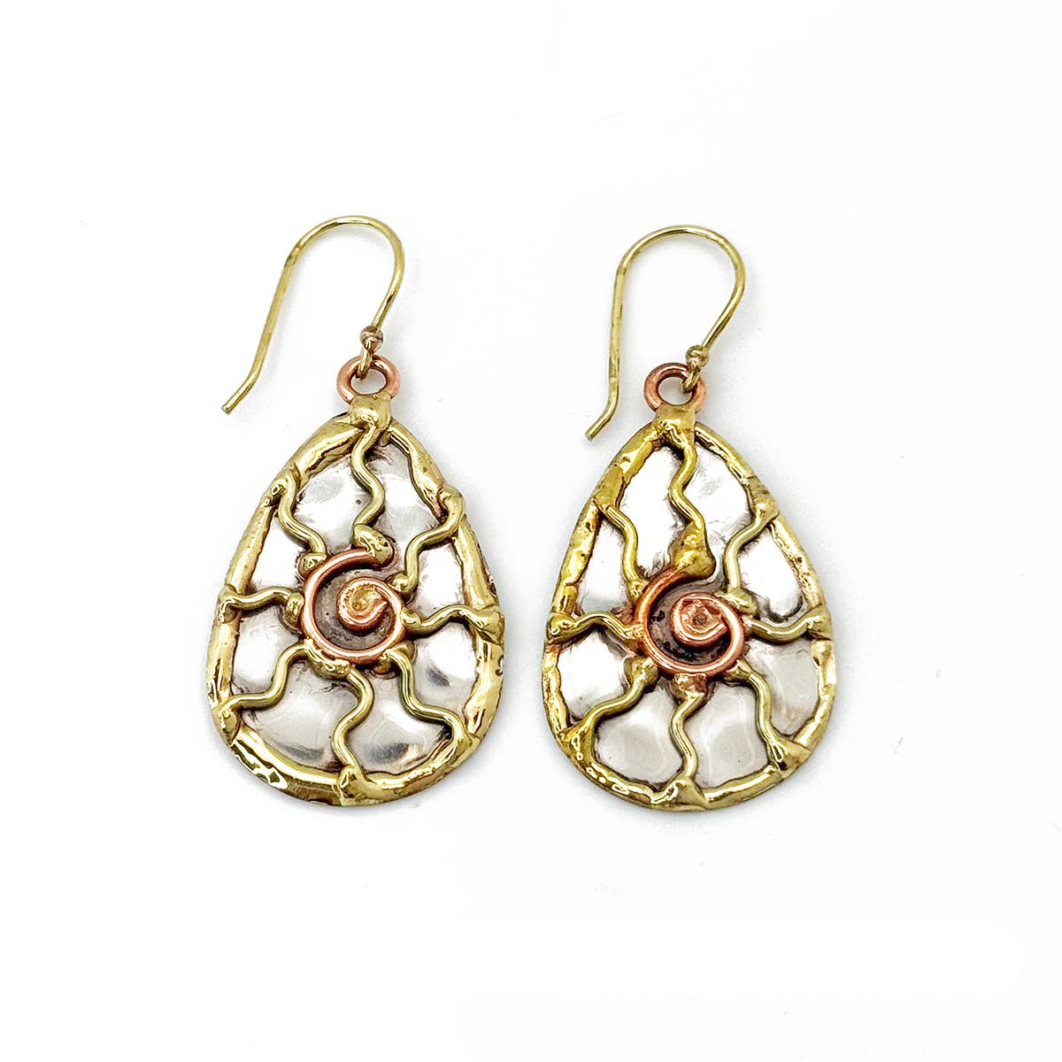 Our Handcrafted Mixed Metal Sun Earrings are an artisanal statement piece, based on style E181. These earrings feature a captivating sun design with a copper spiral center, set against a silver-tone backdrop and framed in rustic brass.