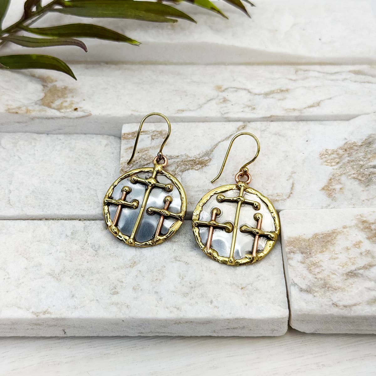 Our Handcrafted Mixed Metal Triple Cross Earrings are an artisanal statement piece. These earrings feature a powerful three-cross design in brass and copper, set against a silver-tone backdrop and framed in rustic brass.