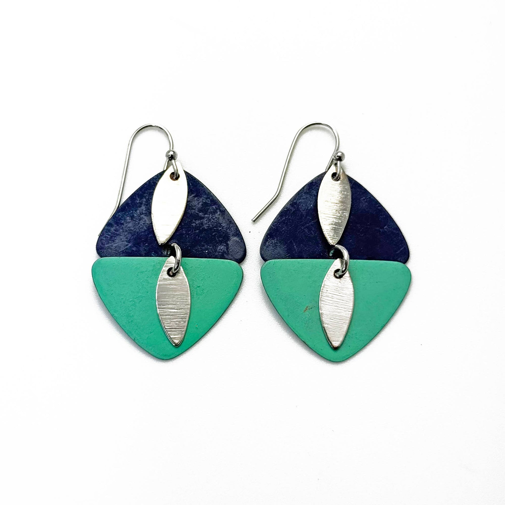 Handcrafted Navy & Teal Patina Mirrored Triangle Earrings