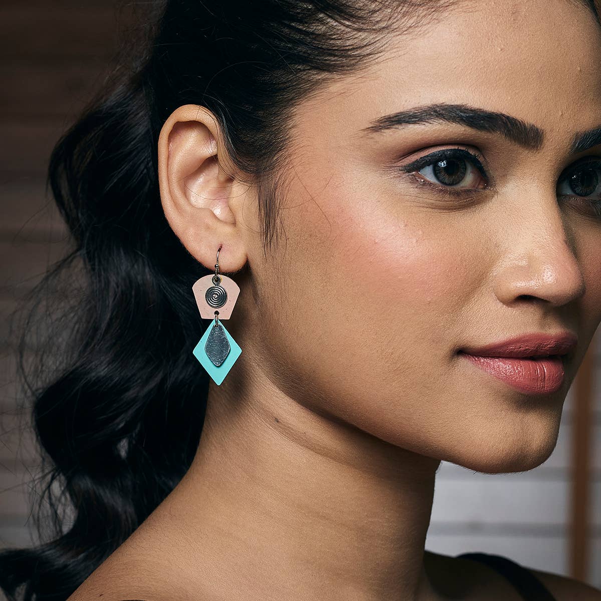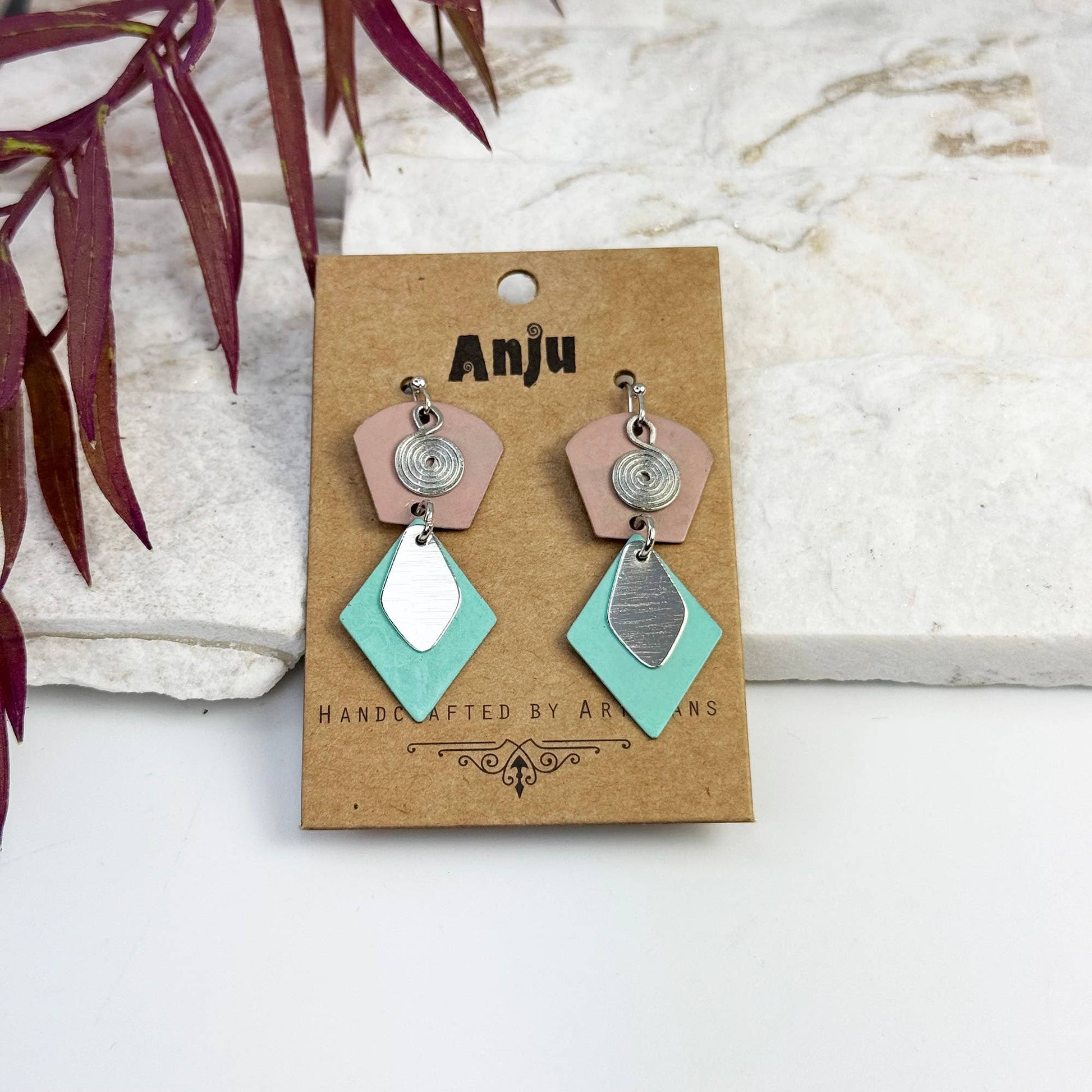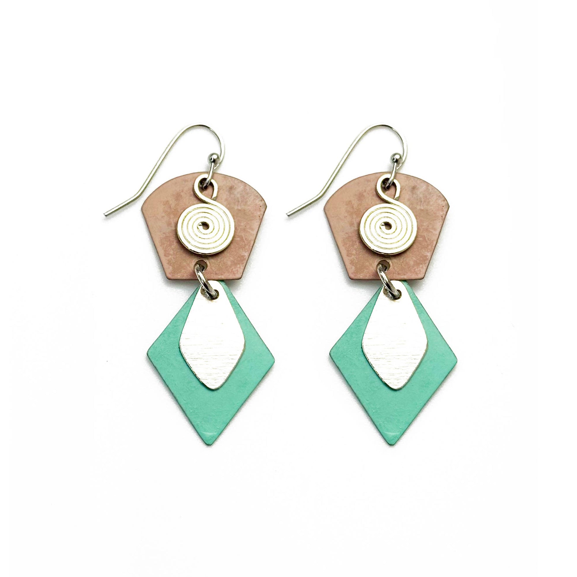 Handcrafted Tan & Teal Patina Two Tier Geometric Earrings