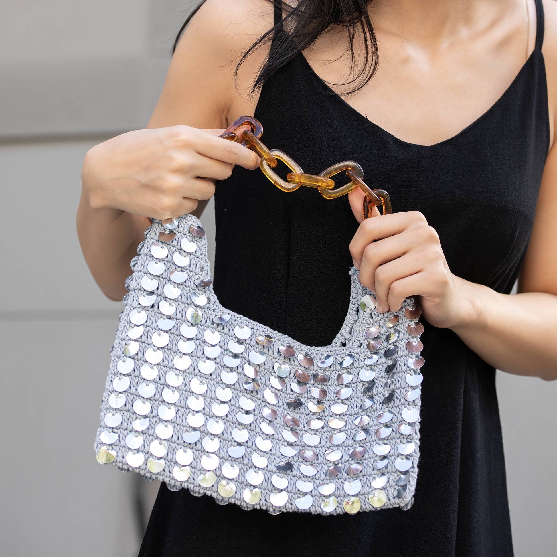 Mia Bag - Cotton Sequined Purse with Link Handle - Silver