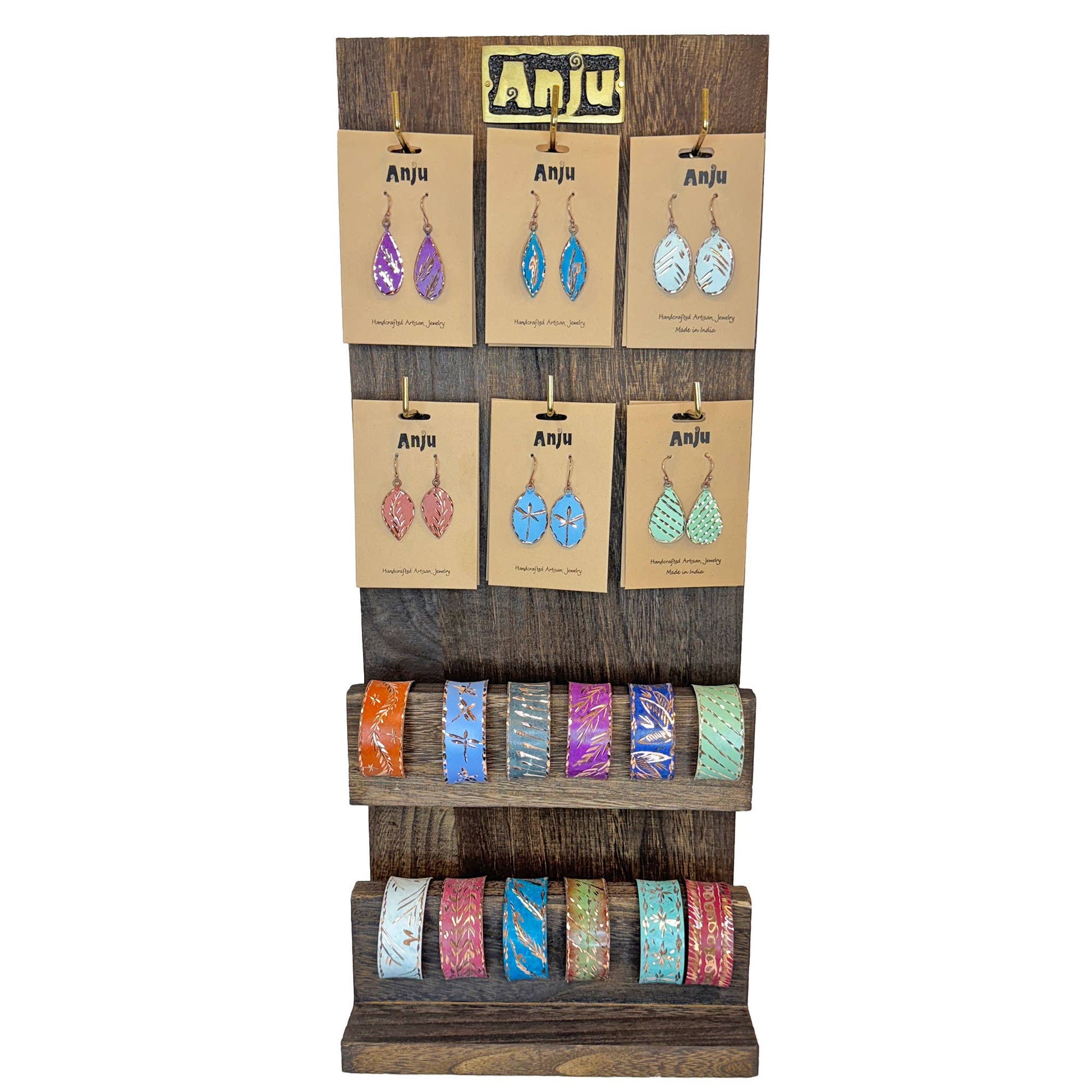 The 12 Patina Engraved Copper Earrings and 12 Cuffs Pre-Pack with Display combines the perfect pairing of handcrafted copper earrings and cuffs, each beautifully engraved and finished with a rich patina for a vintage-inspired, earthy look. This set includes 12 pairs of earrings and 12 matching cuffs, showcasing intricate designs that capture artisanal charm. The included display DW43 ($39) stand makes it easy to showcase these pieces together, offering a cohesive, eye-catching presentation. Ideal for gifting or personal style, this pre-pack is a must-have for customers who love boho elegance and timeless copper accessories.
