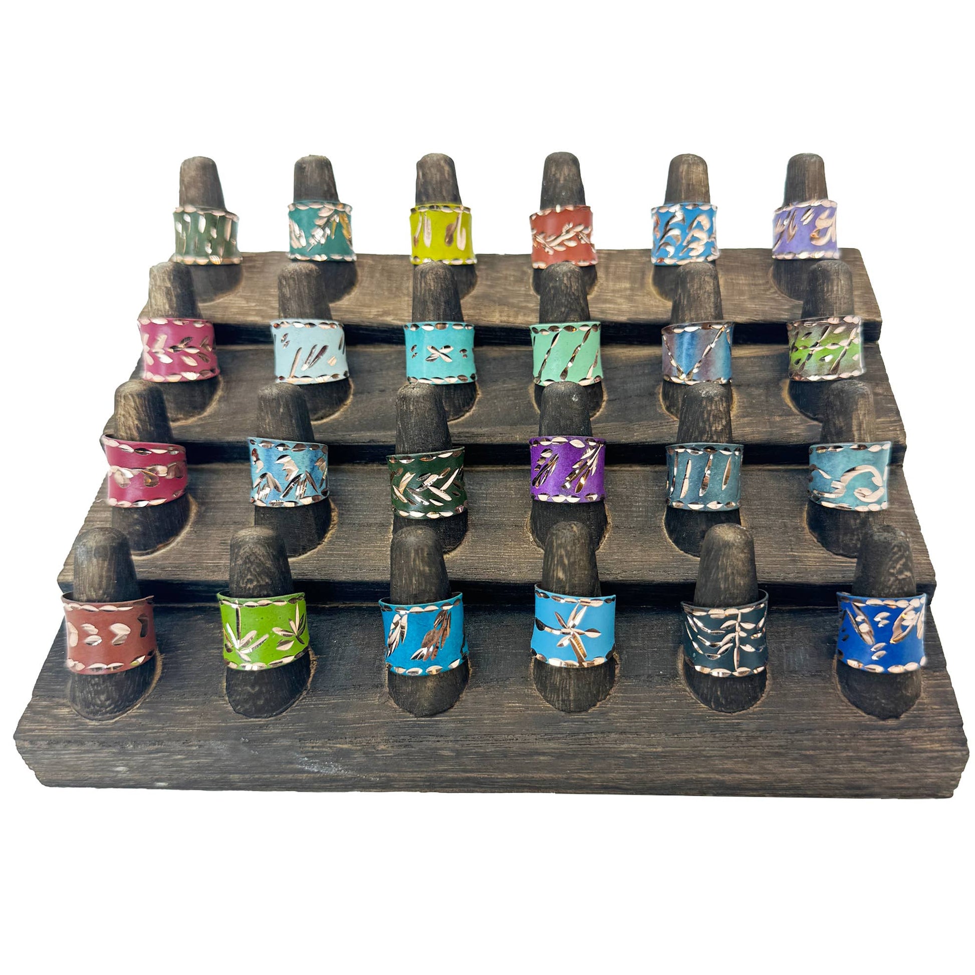 The Patina Engraved Copper 24 Ring Pre-Pack features 24 intricately engraved copper rings, each with a unique patina finish for a beautifully rustic, vintage look. This set comes with a stylish 24 ring display DR24 ($24), making it easy to showcase these eye-catching rings in-store. With their handcrafted detailing and warm, earthy tones, these rings are perfect for customers seeking a distinctive, artisanal accessory. Each piece is handcrafted from copper and coated with a colored enamel. Ideal for gift-giving or personal style, this pre-pack offers an attractive presentation that adds charm and character to any retail space.