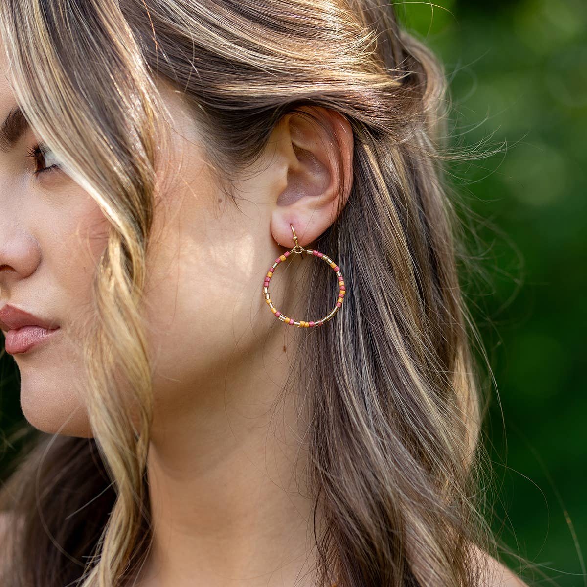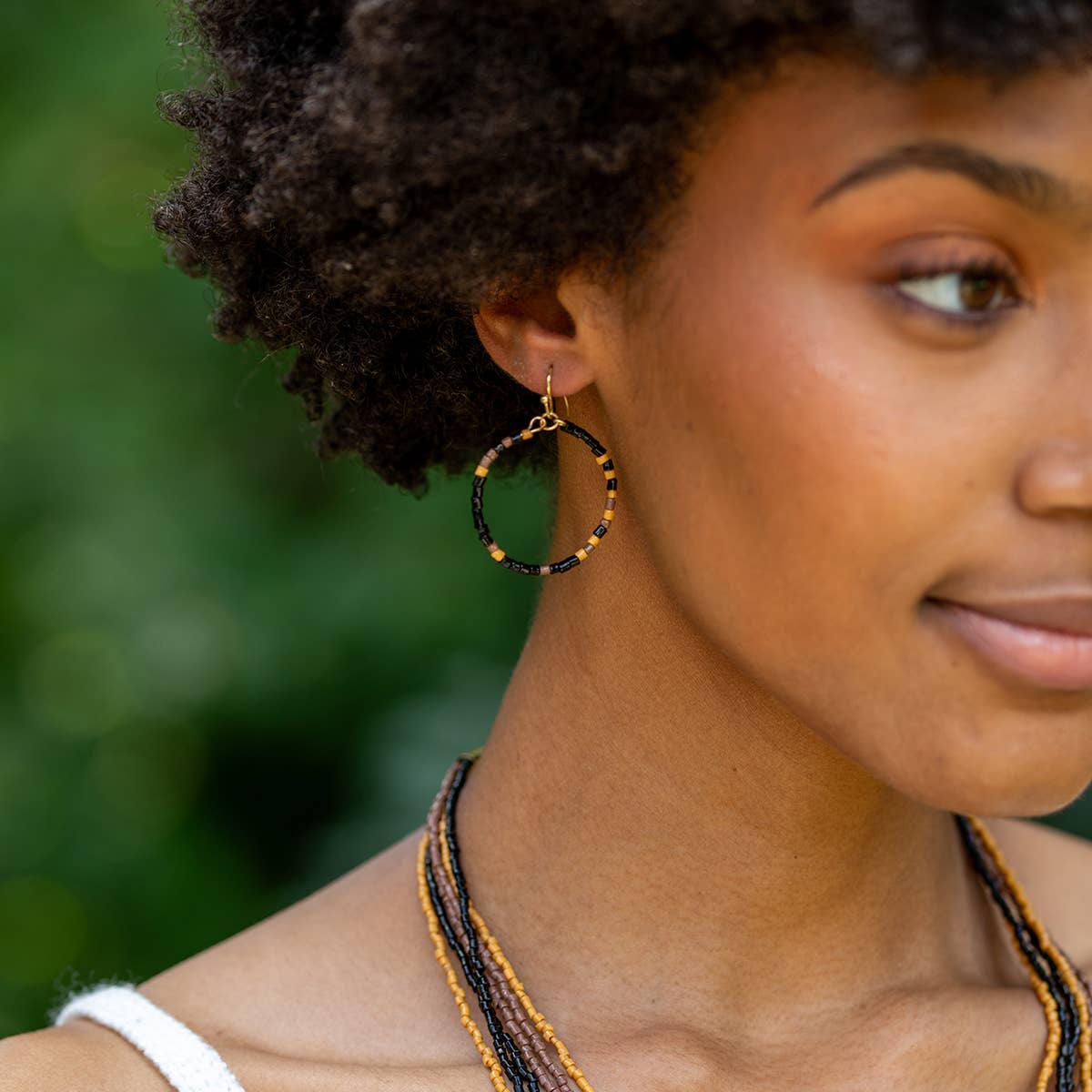We are introducing our colorful Seed Bead Collection! Each item is lovingly hand-crafted by artisans in India. This pre-pack includes 6 Dangle Hoop Earrings, 6 Tassel Earrings ($5 each), and a slotted wooden display. ($10)