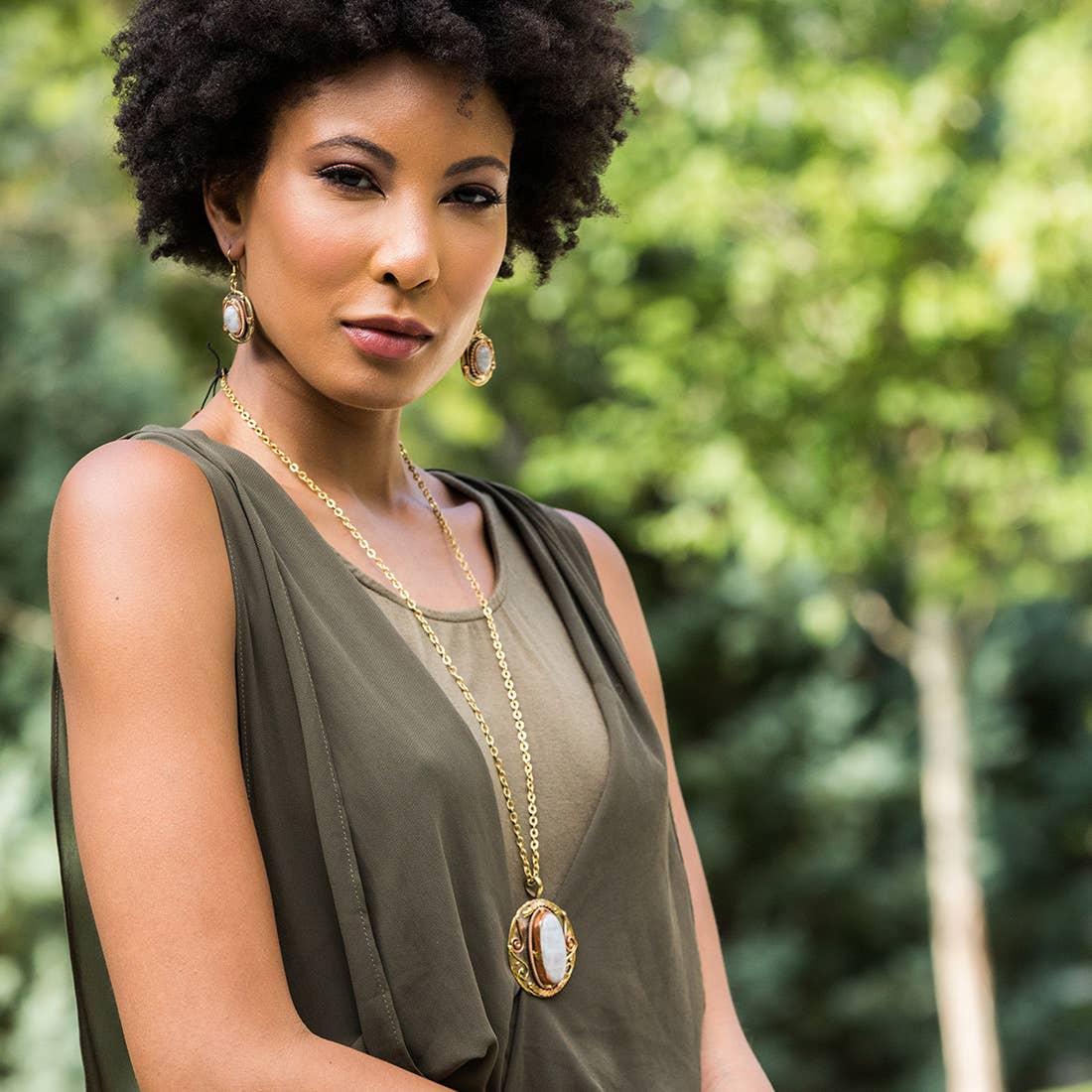 Assortment of 24 pairs of mixed metal earrings with semiprecious stones ($10 each) and a wooden spinner display (DW41, $35). Stainless steel, copper, brass, and various genuine stones. Earring styles may vary from picture.