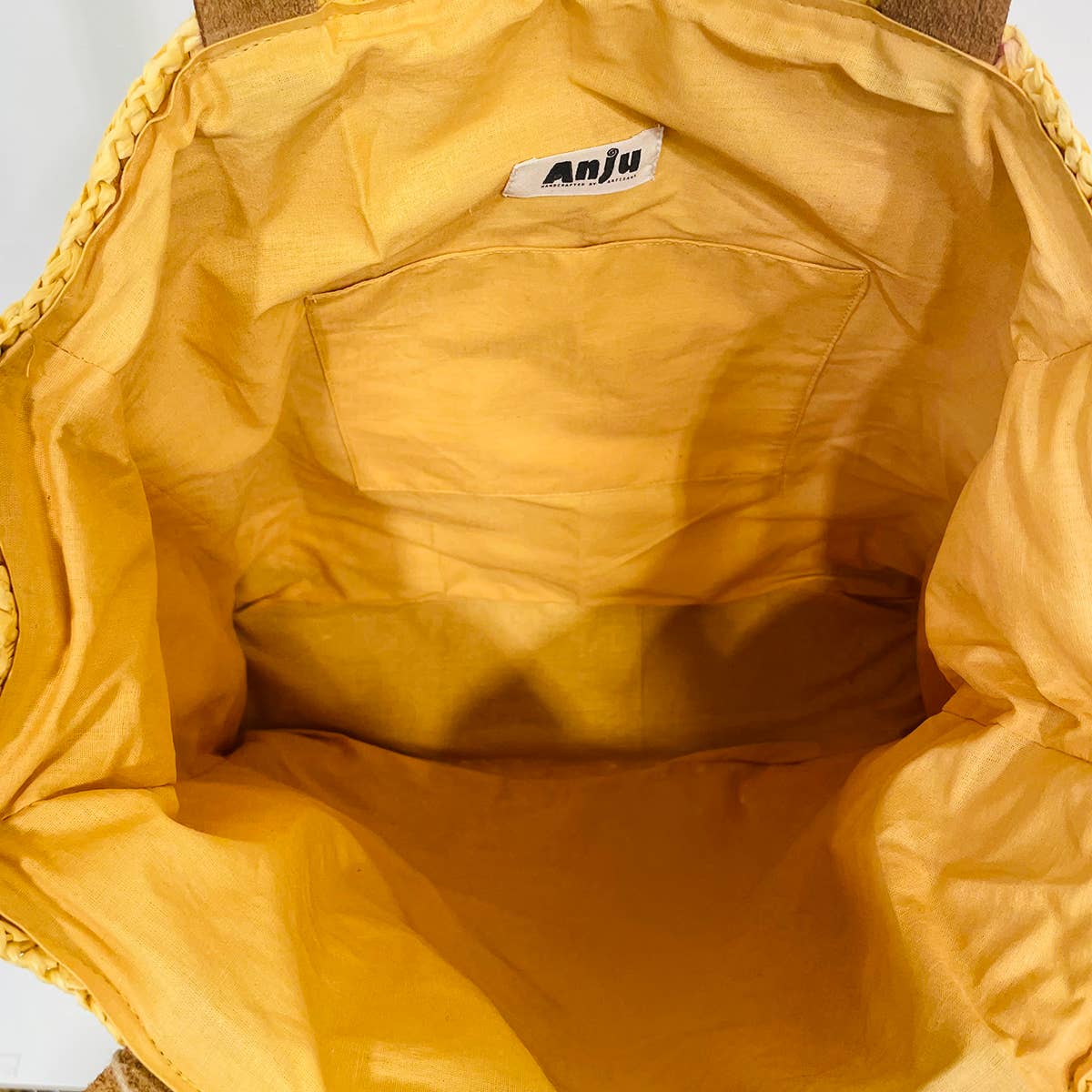 Woven raffia box tote with leather handles. Has inner cotton lining and a pocket.