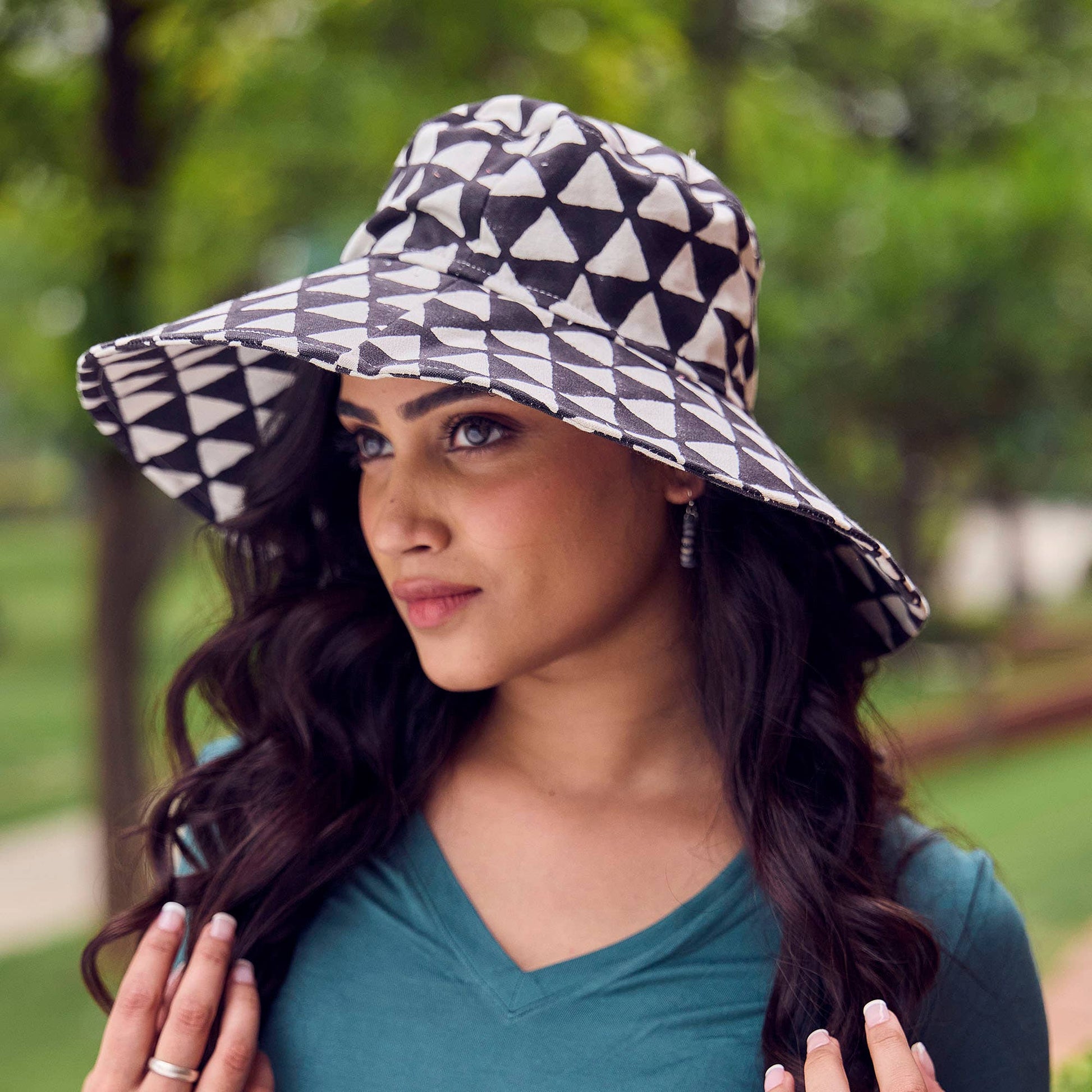 Add a touch of summer charm to your shop with the handcrafted, block-printed Black Midnight Triangles Canvas Sun Hat. A stylish and functional accessory your customers will love. Made from durable yet lightweight canvas, this wide-brimmed hat offers excellent sun protection and a relaxed, fashionable appearance. The fresh gingham pattern makes it a perfect pick for beach days, vacations, or casual outings.