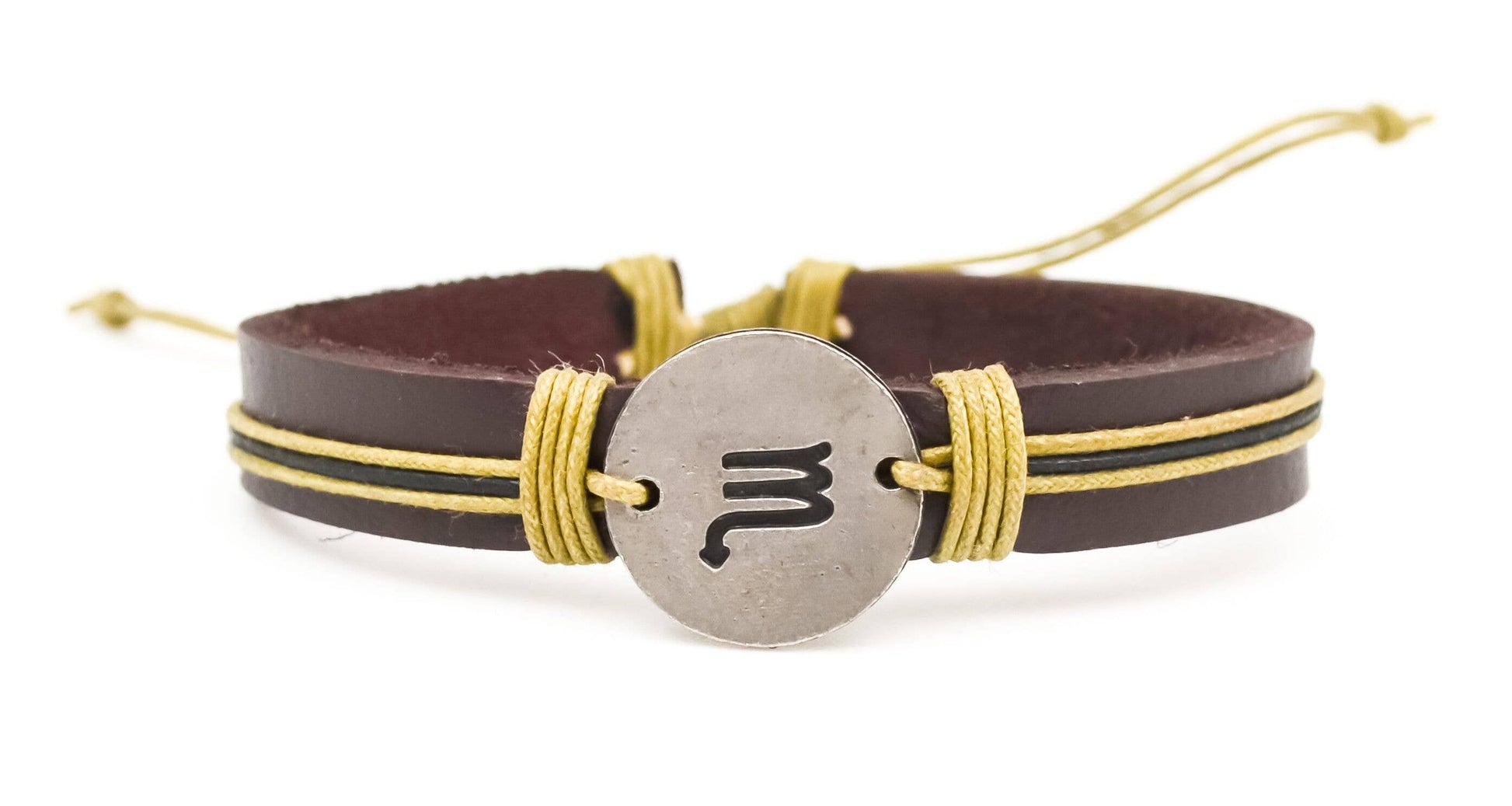 Handcrafted pewter astrology leather pull tie bracelet with zodiac glyph. Comes carded with astrology information, perfect for gifting.